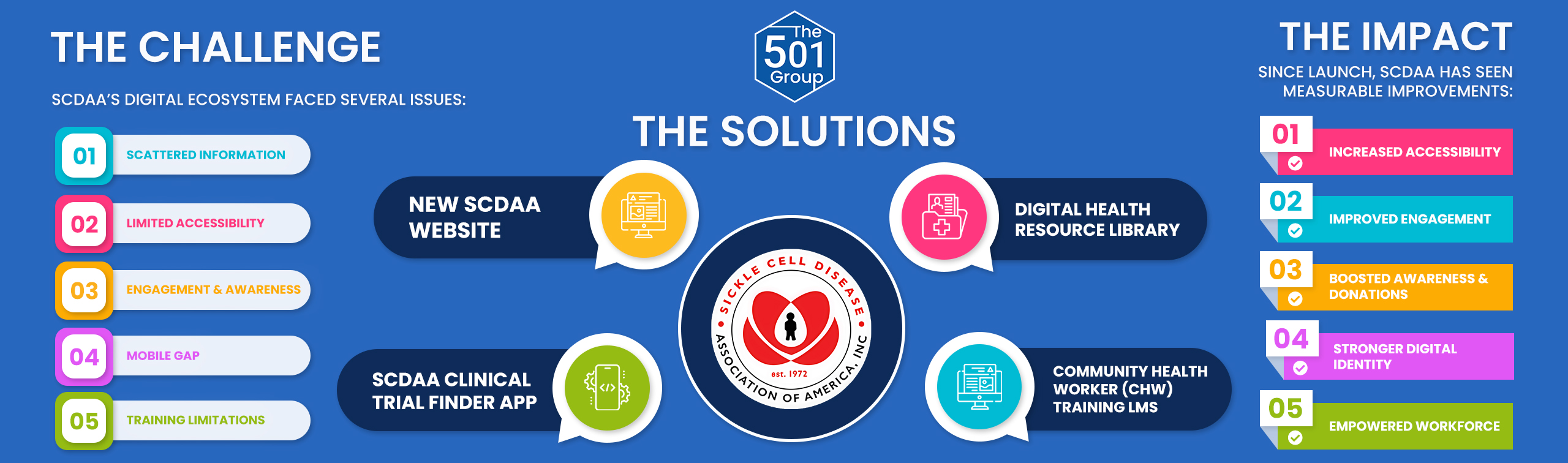 The Sickle Cell Disease Association of America (SCDAA) provides advocacy, education, research, and support for individuals and families affected by sickle cell disease nationwide. With thousands of patients, caregivers, and healthcare providers depending on their resources, SCDAA needed a stronger digital infrastructure to deliver critical information, expand its reach, and build professional capacity among community advocates.